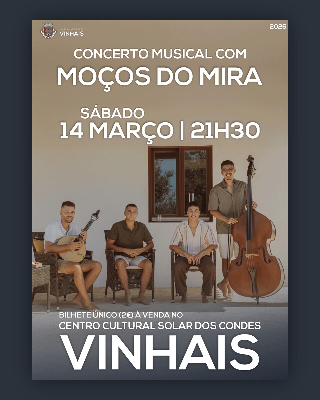 No dia 14 de março de 2026 (sábado), pelas 21h30, o Auditório do Centro Cultural de Vinhais recebe o Concerto Musical com “Os Moços do Mira”, quatro jovens naturais de Odemira que apresentam uma abordagem singular ao Cante Alentejano, integrando a Guitarra Portuguesa como elemento central da sua sonoridade.