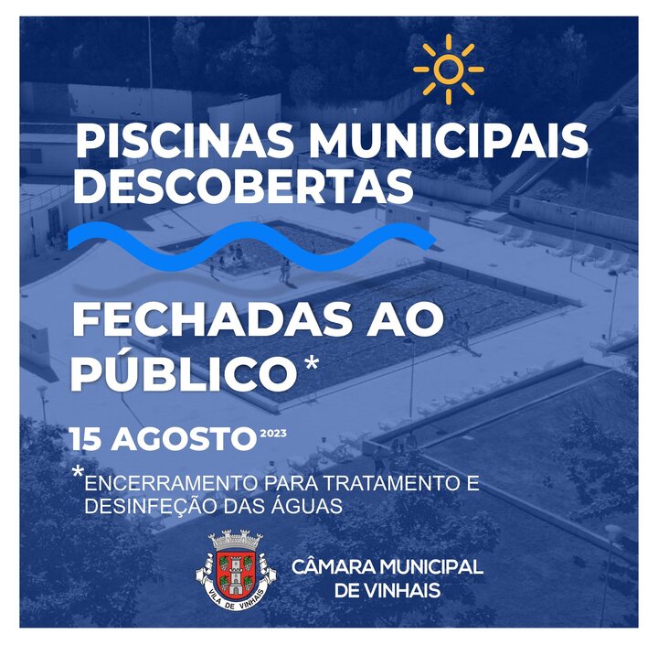 Vimos por este meio informar que amanhã, 15 de agosto de 2023, as Piscinas Municipais Descobertas vão encerrar para a realização de um tratamento e desinfeção das águas.